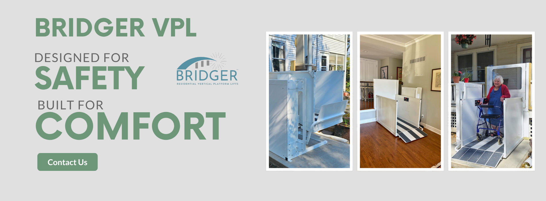 With a focus on accessibility, our Bridger VPL combines beauty, functionality, and durability. They seamlessly integrate into your home’s exterior or interior, providing a smooth, dependable ride for wheelchair users, ensuring you can move freely and confidently at every step.
